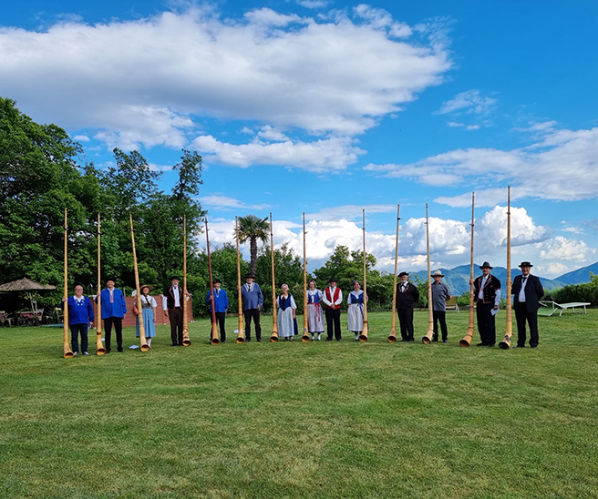 10 "Wiederholungstäter" trafen sich zu einer entspannten Alphornwoche. Nachdem wir in den vergangenen Jahren doch einiges an experimentellem Stoff bearbeitet haben und entsprechend extrem metrisch und rhythmisch unterwegs waren, wollte ich im 22 mal ganz was anderes bieten und nannte die Woche "zurück zu den Wurzeln". Entsprechend war die Literatur auf einem doch sehr hohen Level anzusiedeln. Diese Urformen des Alphornspiels im Sinne von "Ranz des Vaches" oder ähnliche, bewegen sich in Lagen, die selbst gestandene Erststimmenbläser fordern. Wettermässig wurden wir so was von verwöhnt und konnten unsere Ausflüge täglich durchführen. Natürlich mit Grillplausch beim Eurosia und allem Drum und Dran. Ganz kultig war auch unser Promo-Ausflug Cannobio, wo wir in der Fussgängerzohne wieder viele Touristen mit unseren Auftritten überraschten.
